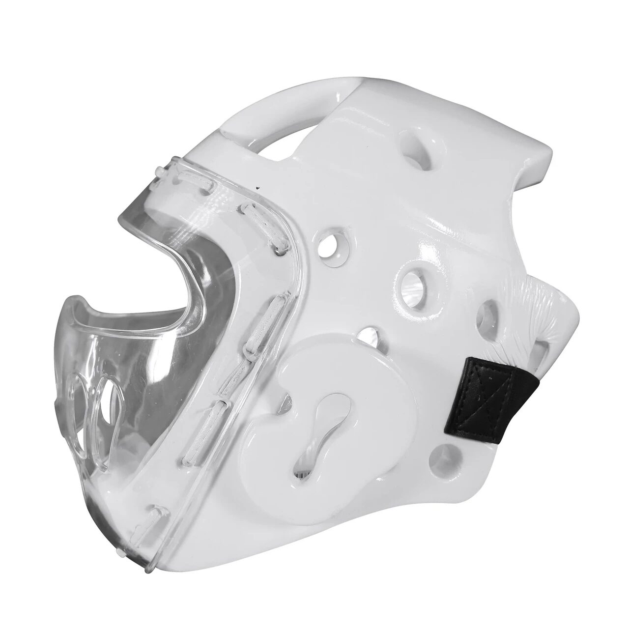 Головной убор из вспененного нитрильного каучука в сочетании с легкой лицевой маской из поликарбоната обеспечивает надежную защиту от случайного контакта с лицом и идеально подходит для интенсивных тренировок по тхэквондо. Вентиляционные отверстия помогают отводить тепло, а регулируемые ремешки на подбородке и спине с застежками-крючками обеспечивают надежную посадку без скольжения, которую легко регулировать между раундами.